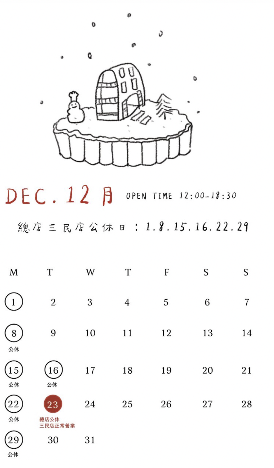 總店.三民店 12月公休日 1.8.15.16.22.(總店23).29